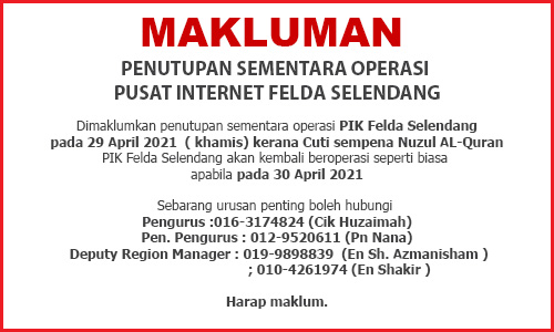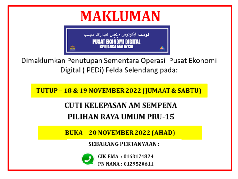 ASSALAMUALAIKUM. MAKLUMAN PENUTUPAN PEDi FELDA SELENDANG 1/2 PADA : 16 SEPTEMBER 2022 HARI : JUMAAT