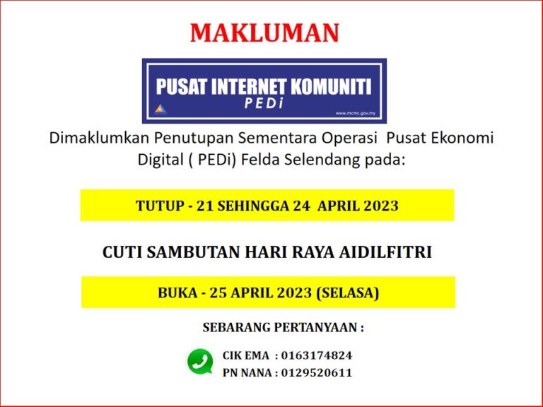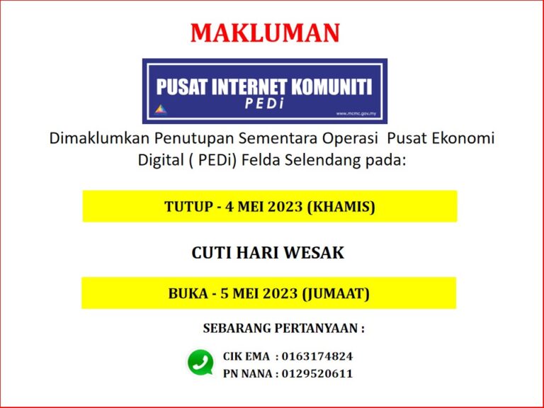 ASSALAMUALAIKUM. MAKLUMAN PENUTUPAN SEMENTARA PEDI FELDA SELENDANG PADA 30 JULAI 2023 BUKA SEMULA PADA 31 JULAI 2023