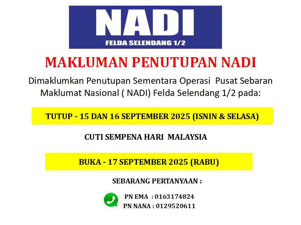 MAKLUMAN PENUTUPAN SEMENTARA OPERASI NADI FELDA SELENDANG 1/2 SEMPENA CUTI HARI MALAYSIA.
